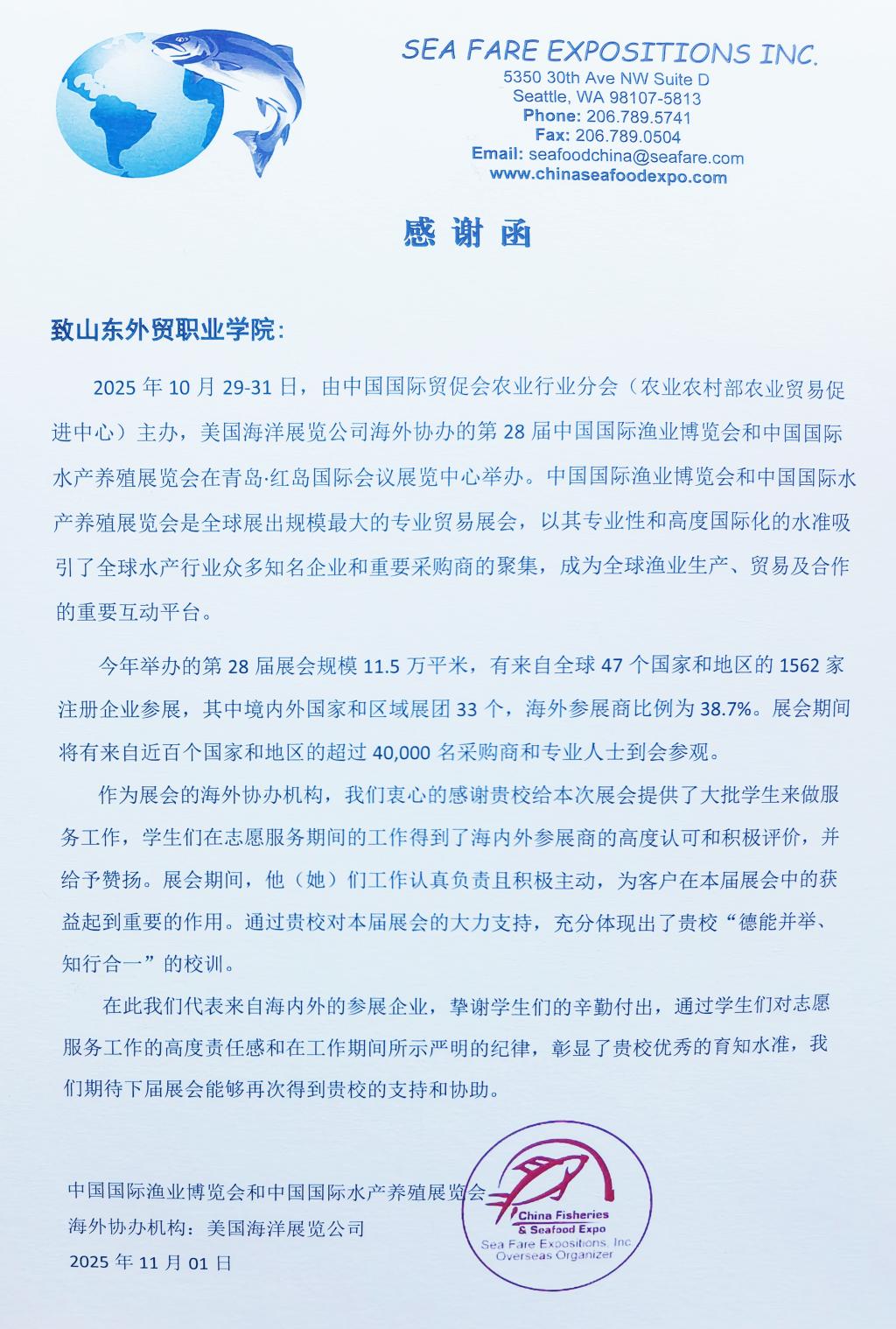 此次渔博会服务,既是检验学习成果的“实战熔炉”,也是连接校园与社会的“成长桥梁”。商外学子以过硬的专业素养和积极的团队协作,圆满完成了各项任务。他们的卓越表现,已成为一张闪亮的“山外名片”,赢得了各方的广泛赞誉。