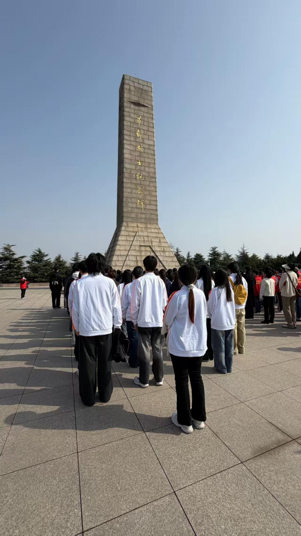 清晨的崂山革命烈士陵园松柏苍翠、庄严肃穆,革命烈士纪念碑静静矗立。学生代表身着统一系服,神情庄重、队列整齐,怀着无比崇敬的心情步入陵园,在纪念碑前整齐列队,肃穆开启祭扫仪式。
